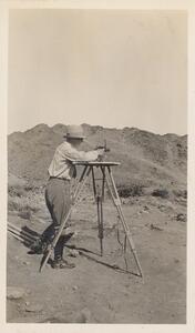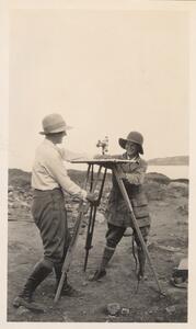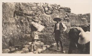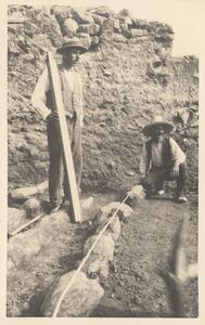 Depicts Jean Mitchel and Ianni (the workman) measuring at the excavation of Thermi. Handwritten caption “Jean and Ioanni measuring in Λ”.