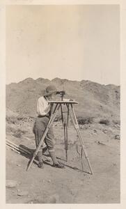Depicts her using a Total Station Transit. Handwritten caption: “At first, Winifred Lamb did the maps.”