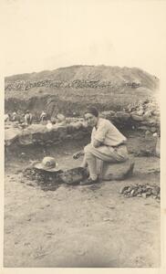 Depicts her sorting sherds at the Thermi excavation. Handwritten caption “NS sorting sherds”.