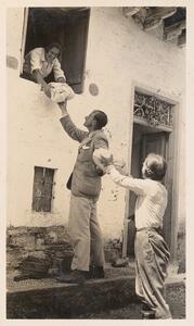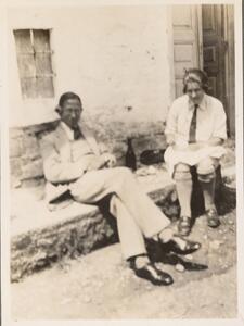 Depicts James Brock and Nine Six sitting next to the door of a house, probably near Thermi (Lesvos). No caption by Lamb, but Helen Waterhouse wrote “James Brock” under him.