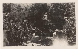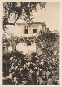 Depicts the view of a garden, probably of the house they stayed in at Thermi (Lesvos), and an unidentified woman doing something there. No caption.