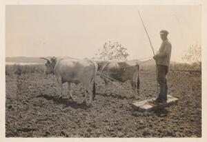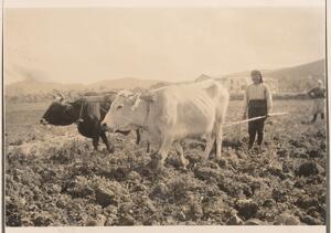 Depicts the animals ploughing with their farmer. No caption.