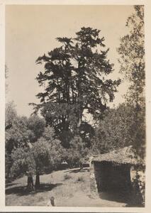 Depicts the tree at Thermi. Handwritten caption “The large cypruss. Thermi”.