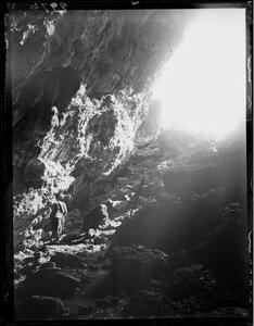 Part of the collection of images of the British School at Athens excavations at Kamares Cave, Crete in 1913. The original description in the SPHS negative register reads: "Kamares cave: view outwards from inside cave".