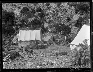 Part of the collection of images of the British School at Athens excavations at Kamares Cave, Crete in 1913. The original description in the SPHS negative register reads: "Kamares cave: more distant view of camp".
