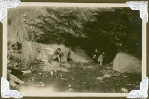 Includes 4 figures standing in the entrance [John Pendlebury, Hilda White and 2 others].