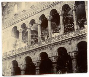 Hagia Sophia-Interior view (south gallery). Written on back in pencil on upper left corner: "Ag. Sophia" and a 4 digit number "5669" which seems to refer to a Hellenic Society negative number. This photograph is probably a copy of a commercial photograph produced by SebSebah & Joallier. It was attributed to Ronald Burrows who was probably the donor of the photograph to the Byzantine Research and Publication Fund