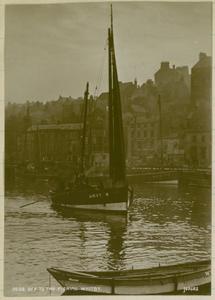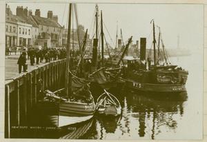 [PEN/2/3/116], Small postcard/print of a photograph of boats moored up, a crowd along the harbour front and a row of buildings, Whitby, United Kingdom, Unknown [c. 1922-28]