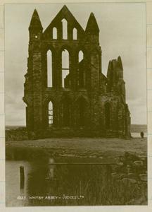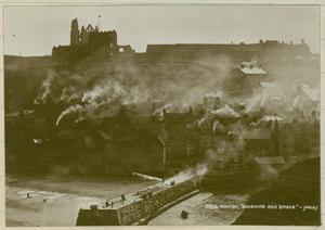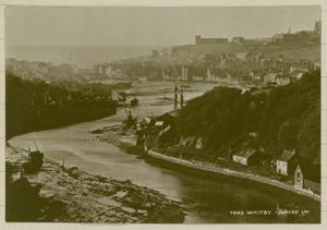 Small postcard/print of a photograph captioned “Sunshine and Smoke”of a view of Whitby showing the Abbey, houses with chimneys smoking and the harbour wall, United Kingdom