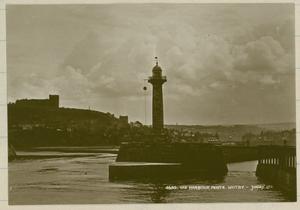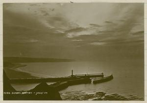 [PEN/2/3/120], Small postcard/print of a photograph captioned “Sunshine and Smoke”of a view of Whitby showing the Abbey, houses with chimneys smoking and the harbour wall, United Kingdom, Unknown [c. 1922-28]