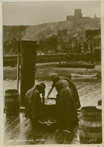 Small postcard/print of a photograph of boats moored up, a crowd along the harbour front and a row of buildings, Whitby, United Kingdom