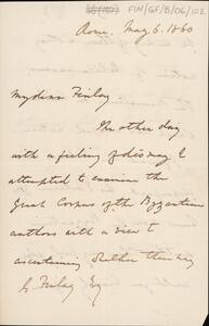 Charles Thomas Newton to George Finlay. Rome, 6 May 1860. Incomplete state of index of Corpus of Byzantine authors; can find no reference to Halicarnassus Museum or Cnidus. Can George Finlay supply information on Caria in Byzantine authors?