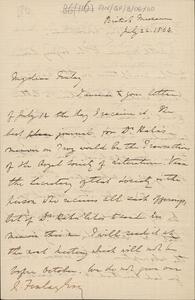 Charles Thomas Newton to George Finlay. British Museum, 6 July 1869. Asks whether Ephemeris Archailologike came out from 1859 to 1862 and was continued from 1863; would like a complete set, also any other publications of the Archaeological Society. Reference to a seventeenth-century MS. containing description of Chios and the Giustiniani in possession of the Bishop of St. Davids.