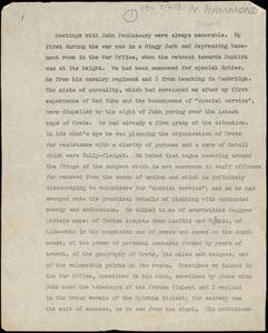 Telling Hilda he had been thinking about John (as it was near the anniversary of John’s death), recounting the time he had spent with John just before the attack on Crete, and telling her how he and others he was with in Crete treasured and respected John. Hammond also gives news of [his wife] Margaret, says that Hilda should visit Margaret in Cambridge, and send love to David and Joan [Pendlebury].