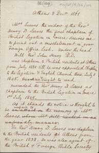 George Finlay to (? Foreign Office). Athens, 8 December 1861. On behalf of Mrs. Leeves, George Finlay points out mis-statement in Foreign Office List concerning the late Revd. Henry D. Leeves, first chaplain of British Legation in Greece.