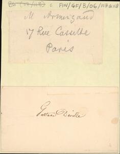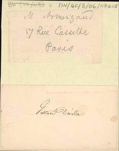 George Finlay to J. Armingaud, Membre de l'Ecole Française d'Athènes [sent to 17, rue Cassette, Paris, by G. Deville]. Athens, 30 August 1864. Requests return of his copy of Pt. I of Thomas and Tafel which A failed to send back before he left Greece 'otherwise I shall feel it a duty to take every measure in my power for obtaining justice. My arms and name are pasted in the volume'. Paper label with M. Armingaud's name and address, attached to same sheet as G. Deville (see above).