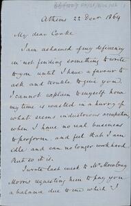 George Finlay to Cooke. Athens, 22 December 1864. Orders for continuation of Illustrated London News, Athenaeum, Saturday Review, and Punch, and subscription to Athenaeum Club. The Times and four weekly papers from England with one from France are now sufficient (incomplete).