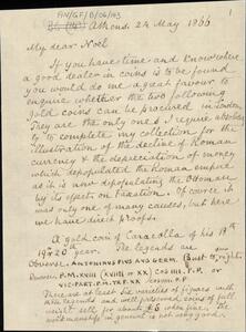 George Finlay to Noel. Athens, 24 May 1866. Asks him if possible to purchase in London two gold coins (Caracalla and Constantine the Great), and Byzantine silver coins.
