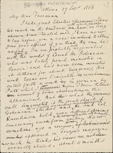 George Finlay to Freeman. Athens, 27 September 1866. Asks F to get Count de Gobineau's letter stating his views on cuneiform writing published in Macmillan's Magazine. This was originally sent to Fraser's Magazine but did not appear, possibly through the influence of Col. Rawlinson whose views differ from those of G.