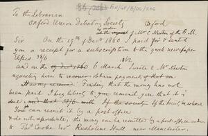 George Finlay to Librarian of Oxford Debating Society on order of Mr. Newton of B.M. n.d. [in or after 1862 ?]. Asking for payment (if the Union is solvent) of subscription to the newspaper Elpis which he took out on its behalf at request of Mr. Newton. Money to be sent to George Finlay c/o T. Cooke, Rusholme Hall, near Manchester.