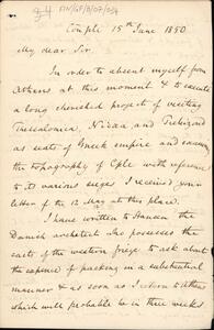 George Finlay to G. Deville, Membre de l'Ecole Française à Athènes. Athens, 30 August 1864 'Carbon' copy requesting D to forward George Finlay's letter re book lent to J. Armingaud.