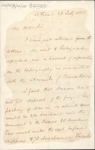 n.d. His copy of L's recent work on Morea not yet arrived but has glanced at copy of British Minister at Agos and sends Tzakonian itineraries which seem missing (Argos-Astros-Lenidi-Palaeocastro-Paleomonembasia) with sketch map.