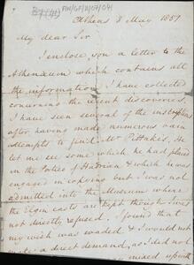 Athens, 8 May 1851. Letter enclosed for Athenaeum containing all that George Finlay has been able to gather about Pittakis' recent find of inscriptions. Impossible to get any leading Greek paper to publish a translation of L's Greece. Psyllas who is an honest politician may print it as a separate pamphlet (end missing; mutilated).
