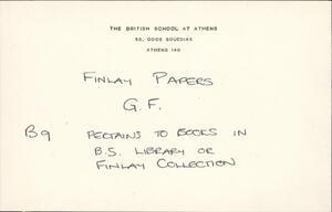 George Finlay's own library is at present split: certain works have been placed in the main library of the British School at Athens and the rest are housed (together with a number of modern works) in the students' common room or in the archive room. Items in this section can be identified only by the title of the book and the shelf-mark and as far as possible they are arranged here chronologically. 'George Finlay' after the present shelf-mark indicates that the book has not been transferred to the main library. This is an interim report: the collection is so widely dispersed and neither this nor the School Library has yet been professionally catalogued so that it is possible that some letters in books may have been overlooked.