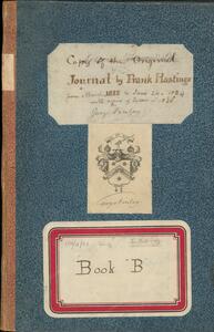Blue mottle boards, rust spine cracked, labelled on front by George Finlay 'Copy of the Original Journal by Frank Hastings from March 1822 to 24 June 1824 with copies of letters in 1826', George Finlay's bookplate, now labelled 'Book B', handwritten, paginated in part (pp. 1-116), with blank pages, bound.
