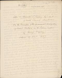 George Finlay to Alexander S. Finlay, M.P., Castle Toward, Argyllshire. Athens, 19 November 1857. 'Carbon' copy of a letter to his cousin A.S.F. entitled 'On the principle of the permanent domination of Great Britain in the Indian empire'.