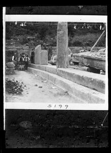 Part of a group of images from explorations and excavations on the island of Melos conducted by the British School at Athens from 1896 to 1899. The original description in the SPHS register reads: "Phylakopi: fig. 6. Stone washing trough in situ".
