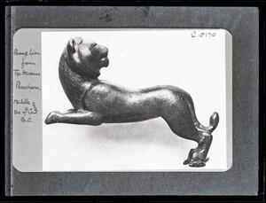 Part of the collection of images, 1930-39, of the British School at Athens excavations at Perachora, Corinthia. The original description in the SPHS register reads: "Perachora: bronze lion from the Heraeum. Middle of 7th century BC".