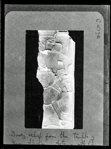 Part of the collection of images, 1930-39, of the British School at Athens excavations at Perachora, Corinthia. The original description in the SPHS register reads: "from the temple of Hera Akraia. Ivory relief-about 7th century BC".