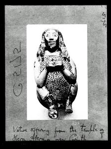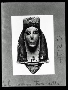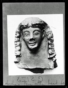 Part of the collection of images, 1930-39, of the British School at Athens excavations at Perachora, Corinthia. The original description in the SPHS register reads: "from the temple of Hera Akraia. Archaic terracotta head, late 7th century BC".