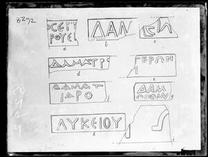 Part of the collection of images, 1906-1910, of the British School at Athens excavations at Sparta, Laconia. The original description in the SPHS register reads: "Sparta: parts of Cyrenaic cycle from the Artemision".