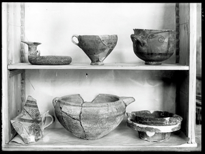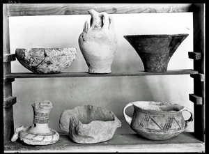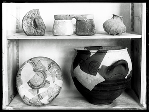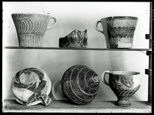 Part of a group of images from explorations and excavations on the island of Melos conducted by the British School at Athens from 1896 to 1899. The original description in the SPHS register reads: "Phylakopi pottery: Incised ware (one plain pot of Kamares shape)".