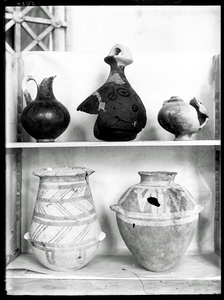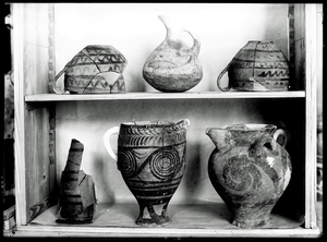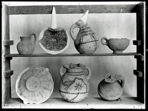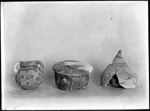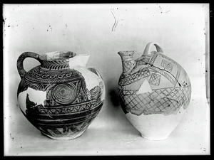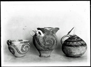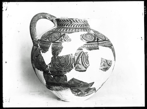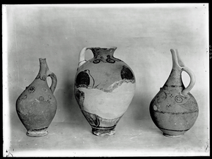 Part of a group of images from explorations and excavations on the island of Melos conducted by the British School at Athens from 1896 to 1899. The original description in the SPHS register reads: "Phylakopi pottery: painted geometric, unpainted jug of Kamares shape".