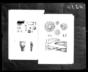 Part of a collection of images of the BSA's 1920s excavations at Mycenae. The original description in the SPHS register reads: "Mycenae: Granary. Gold rosettes, ivory tusks. bucranium pend. 8th shaft grave".