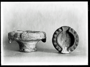 Part of a group of images from explorations and excavations on the island of Melos conducted by the British School at Athens from 1896 to 1899. The original description in the SPHS register reads: "Phylakopi pottery: carved stone lamp".