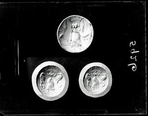 Part of a collection of images of the BSA's 1920s excavations at Mycenae. The original description in the SPHS register reads: "Minoan gems: (a) from Crete (b.c) from Mycenae: the snake goddess".