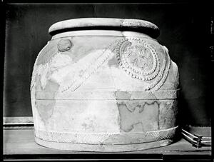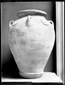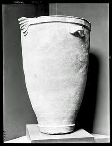 Part of a group of images from the British School at Athens excavations at Palaikastro, Crete in the 1902-1905. The original description in the SPHS negative register reads: "Palaikastro: MM III pithos (BM No. A 736, BSA Supp I pl. xxii a)".