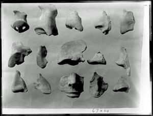 Part of the collection of images, 1906-1910, of the British School at Athens excavations at Sparta, Laconia. The original description in the SPHS register reads: "Sparta: T.C. noses".
