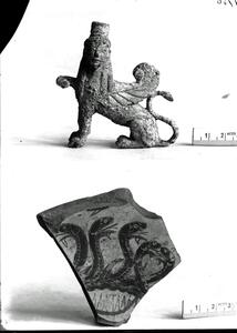 Part of the collection of images, 1906-1910, of the British School at Athens excavations at Sparta, Laconia. The original description in the SPHS register reads: "Sparta: Sphinx: vase fragment".