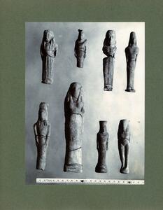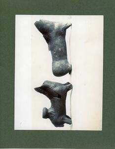 Part of the collection of images, 1906-1910 and 1924-1927, of the British School at Athens excavations at Sparta, Laconia. The original description in the SPHS register reads: "Sparta, (various years' digs). Six Bronze statuettes: Acropolis: One is a sphinx, one a fluta player".