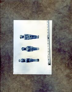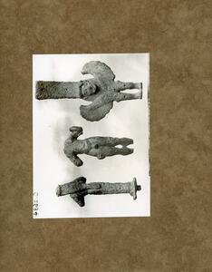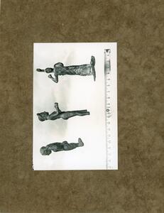 Part of the collection of images, 1906-1910 and 1924-1927, of the British School at Athens excavations at Sparta, Laconia. The original description in the SPHS register reads: "Sparta, (various years' digs). Three Bronze statuettes: Acropolis: kneeling man, nude lady and Athena Promachos".