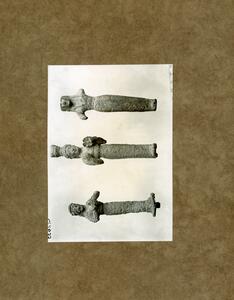 Part of the collection of images, 1906-1910 and 1924-1927, of the British School at Athens excavations at Sparta, Laconia. The original description in the SPHS register reads: "Sparta, (various years' digs). Three Bronze statuettes: Acropolis: standing, all 6th cent. types".