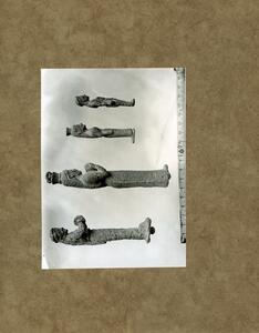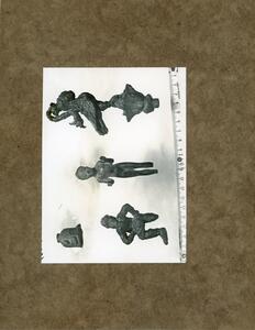 Part of the collection of images, 1906-1910 and 1924-1927, of the British School at Athens excavations at Sparta, Laconia. The original description in the SPHS register reads: "Sparta, (various years' digs). Four Bronze statuettes: Acropolis: one is Nike, one a negress, one squatting Geometric man".