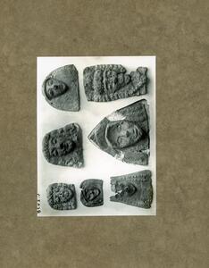 Part of the collection of images, 1906-1910, of the British School at Athens excavations at Sparta, Laconia. The original description in the SPHS register reads: "Sparta, Orthia Site 1906-10. Architectural terracottas: four pieces three have large godroour in relief".