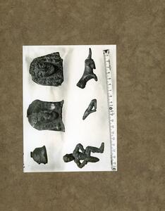 Part of the collection of images, 1906-1910 and 1924-1927, of the British School at Athens excavations at Sparta, Laconia. The original description in the SPHS register reads: "Sparta, (various years' digs). Four Bronze statuettes: Acropolis: kneeling man (back view), nude lady, siren & helmet".