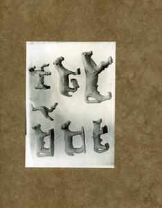 Part of the collection of images, 1906-1910 and 1924-1927, of the British School at Athens excavations at Sparta, Laconia. The original description in the SPHS register reads: "Sparta, (various years' digs). Bronze. Seven animals (sheep, oxen, horse, bird)".